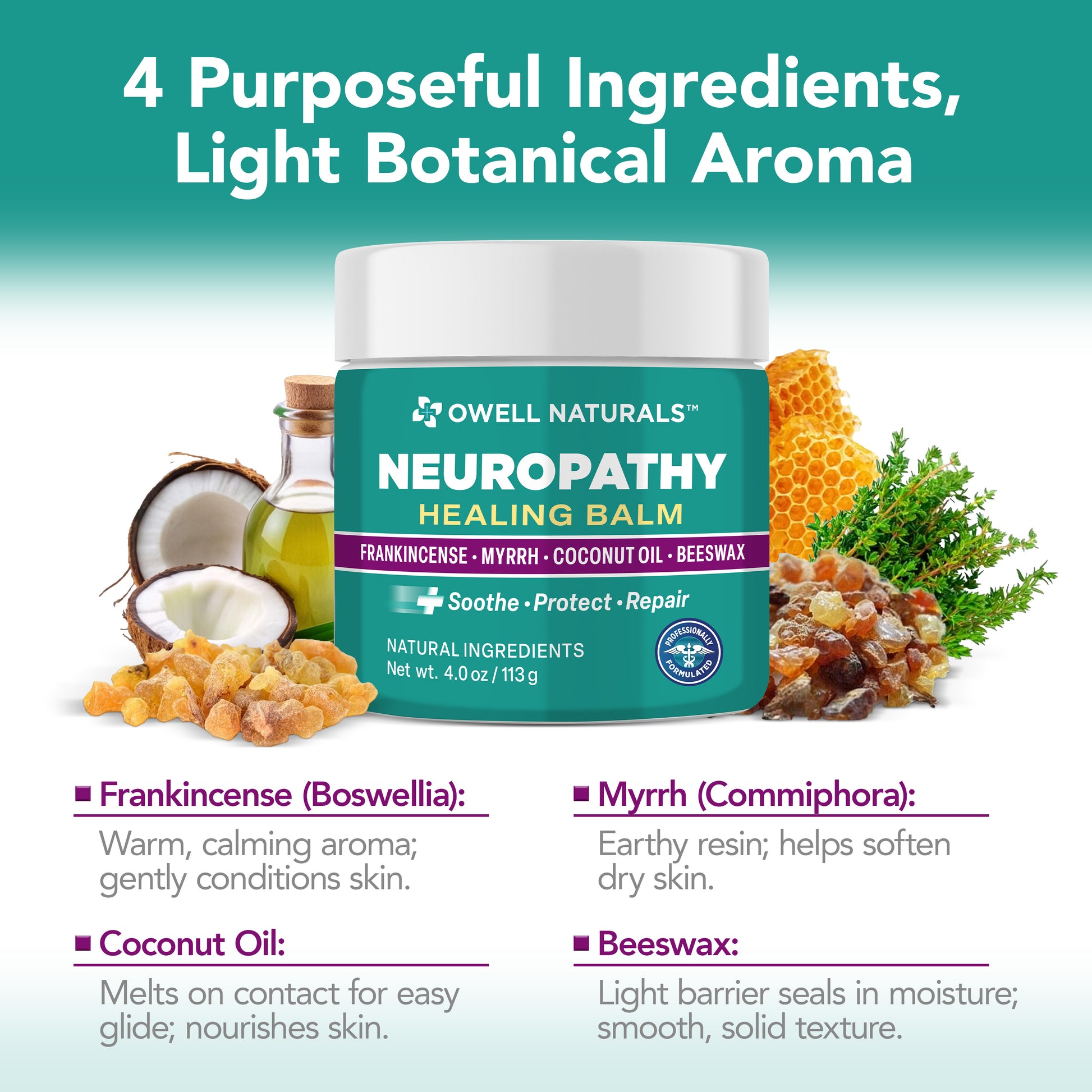 OWELL NATURALS Neuropathy Healing Balm – with Frankincense, Myrrh, Coconut Oil & Beeswax – Soothe, Protect & Repair
